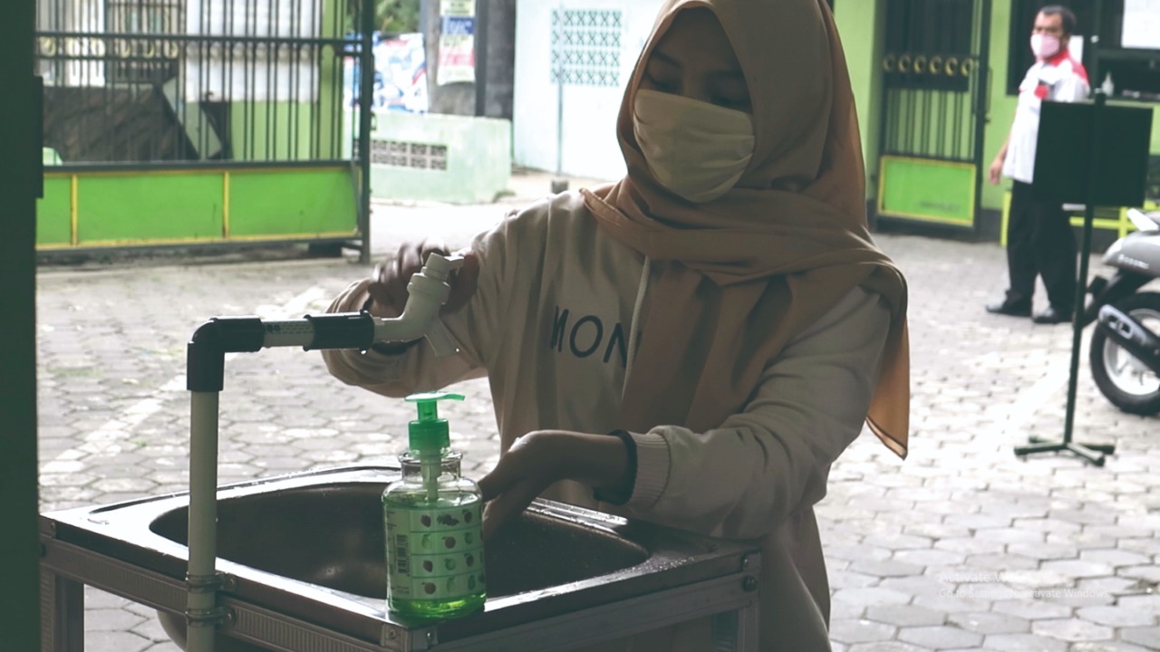 Sekolah menyediakan tempat cuci tangan & sabun di beberapa tempat untuk mengurangi risiko penyebaran virus corona. Kursi tunggu yang berada didekat ruang kelas juga diberi jarak agar lebih aman.